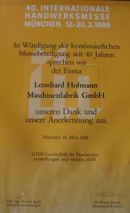 1988 erhält HOFMANN eine Auszeichnung für die 40-jährige Beteiligung auf der 40. Handwerksmesse in München.