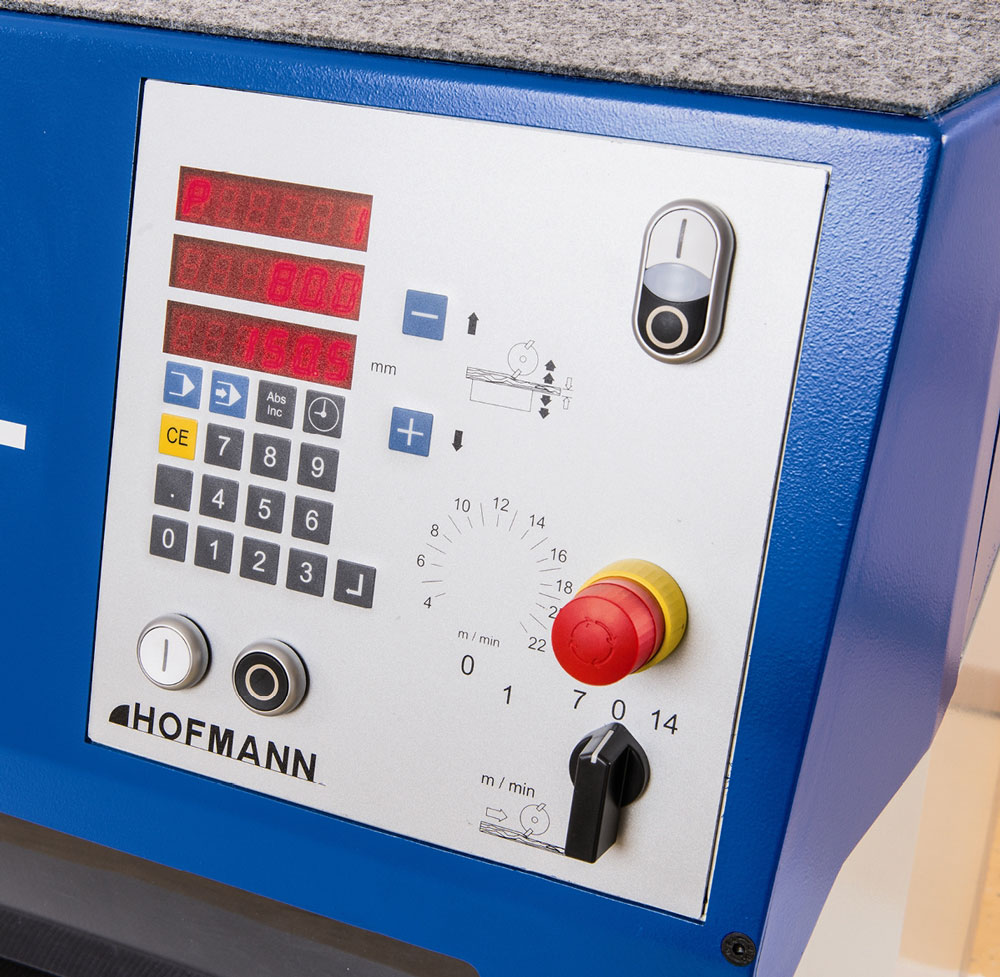 • Elektrische Dickentischverstellung mit Tastern für die Verstellung im Eil- oder Schleichgang sowie Verstellung auf 1/10 mm genau
