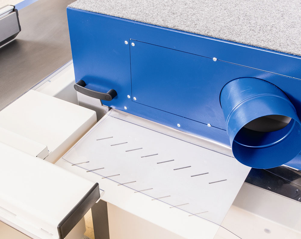 • Drehknopf mit Skala für die Vorspannung des Auszugsdruckbalkens