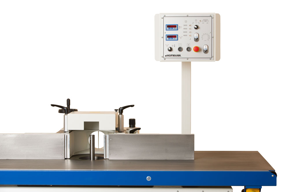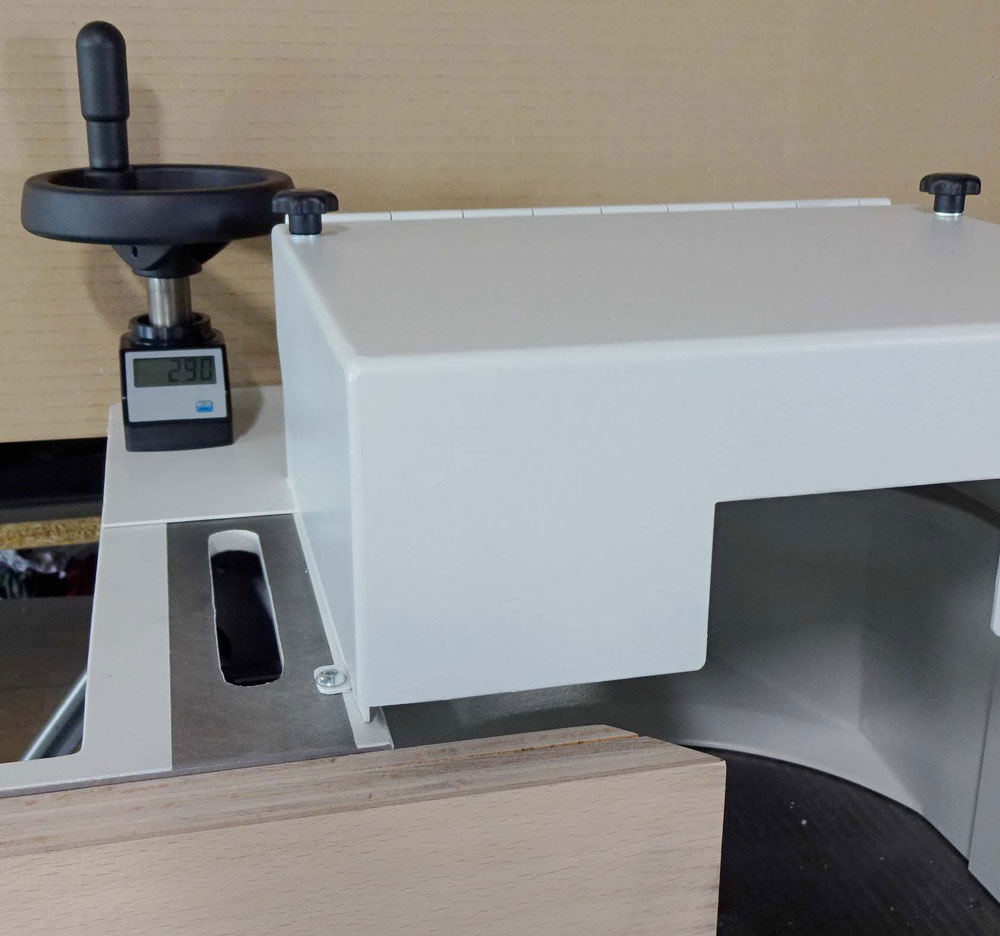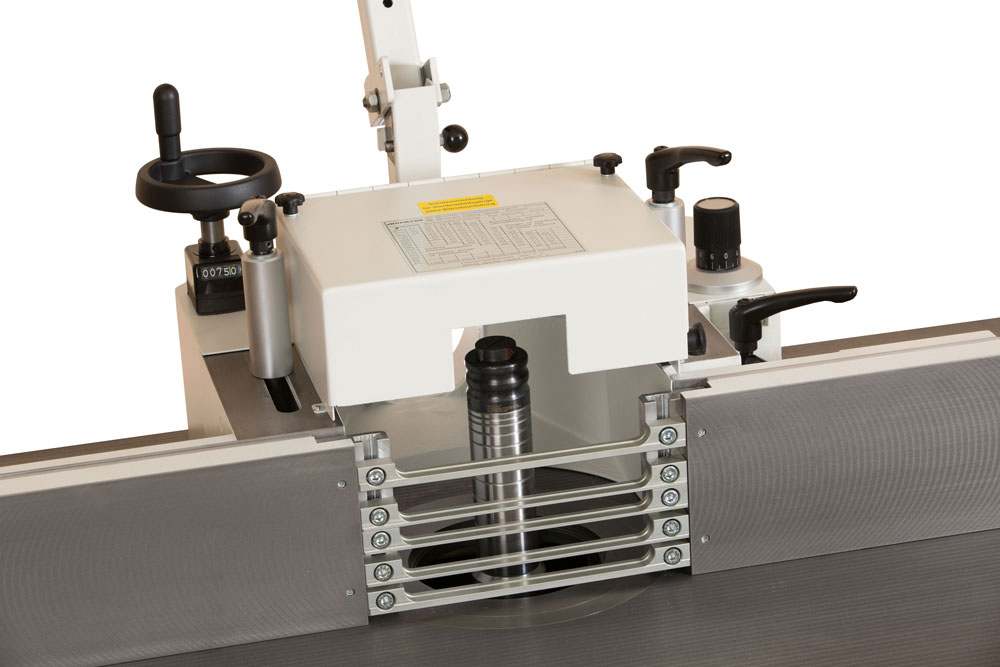 • Fräsanschlag Typ 2601 Effizient. Gesamtverstellung über Handrad nach Digitalzähler und Backenfeineinstellung der Einlaufbacke über Zylinderdrehknopf nach Skala auf 0,1 mm mit Multiplex-Anschlagbacken (Nach Abheben des Anschlags ist der komplette Tisch frei verfügbar nach Wiederaufbau muss keine Referenzfahrt durchgeführt werden)